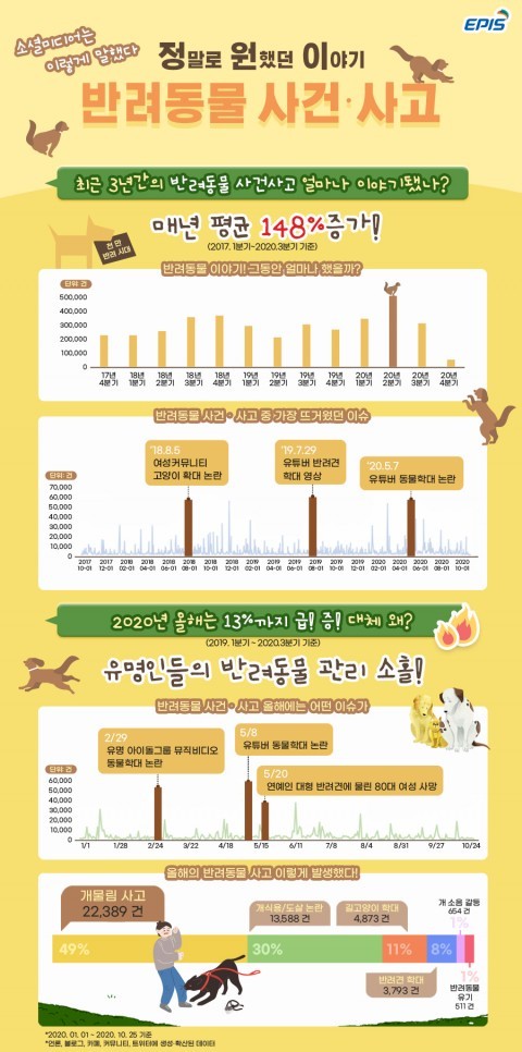 반려동물 사건·사고 정보량은 지난해 소폭 감소(2018년 119만238건→2019년 106만4873건)했다. 하지만 올해 유튜버의 동물학대 논란 및 각종 개물림 사고 발생으로 정보량이 급증(2019년 106만4873건→2020년 120만6584건)했다.