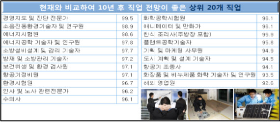 10년 후 유망 직업 20위 발표 소식을 접한 네티즌들은 "10년 후 유망 직업 20위 발표, 취준생은 마냥 슬픕니다" "10년 후 유망 직업 20위 발표, 대입 때 영향력 미치려나" "10년 후 유망 직업 20위 발표, 10년 후 이직 결정" 등 다양한 반응을 보였다.
