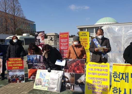 '1500만 반려인연대' 회원들이 17일 기자회견을 열고 "개와 고양이의 도살·식용·판매를 금지하는 동물보호법 개정안이 올해 반드시 통과돼야 한다"며 목소리를 높였다.