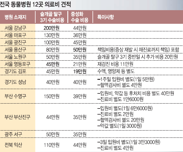 최근 국민일보가 지난 23일부터 28일까지 전국 동물병원 12곳의 중성화 및 슬개골 수술 견적을 비교한 결과는 천차만별이었다. 일부 동물병원은 상담 첫 마디에 저렴한 비용을 제시한 뒤 상담 도중에 안전상 필수적인 사전 혈액검사, 수액 시술을 추가로 청구했다. 의료 정보가 부족한 동물 보호자 입장에서는 꼼짝없이 병원 측의 안내에 따라야 하는 상황이다.