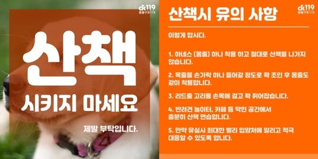 이어 임시보호자들이 강아지와 꼭 산책을 해야 하는 상황이라면 Δ하네스(가슴줄) 하나만 착용한 상태로 산책 나가지 않기 Δ목줄을 손가락 하나 들어갈 정도로 꽉 조인 후 몸줄도 같이 착용하기 Δ리드줄 고리를 손목에 걸고 꽉 쥐기 Δ반려견 놀이터, 카페 등 막힌 공간에서 충분히 산책 연습하기 Δ강아지 유실시 최대한 빨리 입양처에 알리기 등을 제안했다.