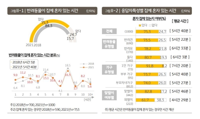 하지만 반려동물의 75.3%는 집에 반려인 없이 혼자 있는 경우가 있었고, 이들이 홀로 남겨진 시간은 하루 평균 5시간 40분으로 조사됐다.