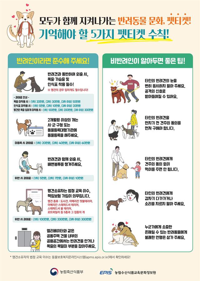 위반 행위에 따라 ▲반려견 미등록 20만 원 ▲등록대상동물 변경 미신고 10만 원 ▲인식표 미부착 5만 원 ▲목줄 등 안전조치 미이행 20만 원 ▲배설물 미수거 5만 원 ▲맹견소유자 준수사항 위반 시 100만 원의 과태료를 부과할 방침이다.