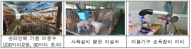 시설·인력 기준 위반 사례로는 관리 인력 확보 기준 위반이 4건으로, 가장 많았다. 12개월령 이상의 개나 고양이 75마리당 1명 이상의 사육·관리 인력을 둬야 하는데 이를 어긴 것이다.