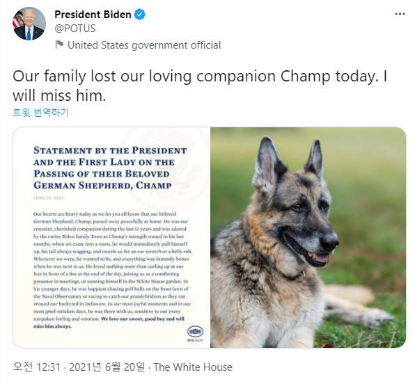 지난달 19일 바이든 대통령과 부인 질 바이든 여사는 성명을 통해 챔프가 세상을 떠났다고 밝혔다. 성명에서 “사랑하는 챔프가 집에서 평화롭게 세상을 떠났다는 소식을 알리게 돼 마음이 무겁다”며 “그가 어릴 때 잔디밭에서 골프공을 쫓거나 델라웨어에 있는 우리 뒷마당 주변에서 손자들을 잡으려 달리는 것을 가장 행복해했다”고 밝혔다.
