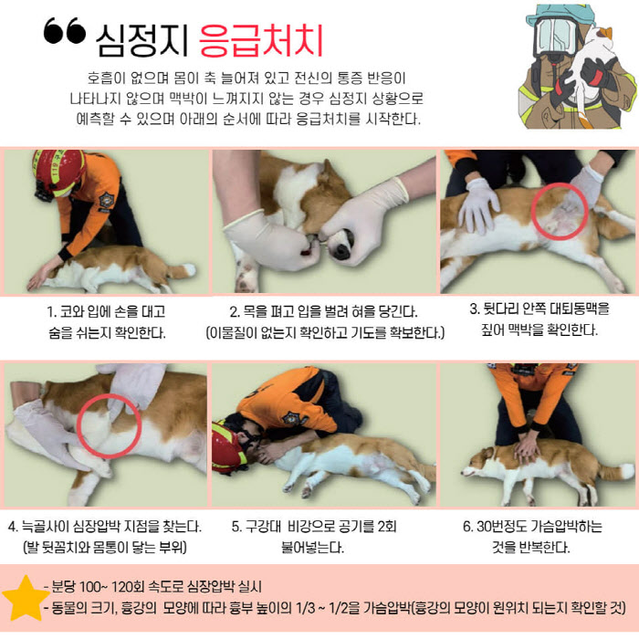 심정지 등으로 심폐소생술이 필요할 때에는 반려동물의 반응과 기도를 확인한 뒤 대형·중형견은 양손으로, 소형견은 한 손으로 가슴 부분이 3분의 1 정도 들어가게 1초당 2회 속도로 30회 반복해 눌러야 한다.