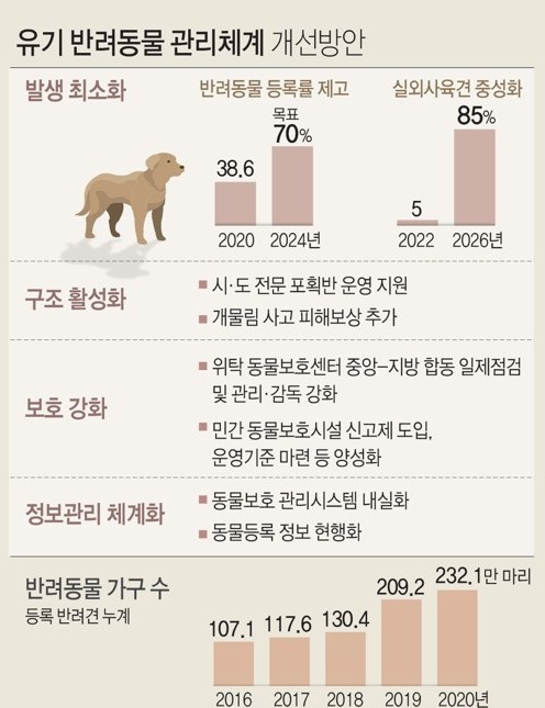 또 군입대나 교도소·구치소 수용, 질병 등 제한적인 사유가 있을 때 동물보호센터에 소유권 이전을 할 수 있도록 하는 '반려동물 인수제' 도입을 검토한다.