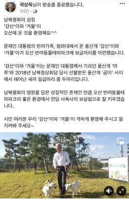 곽상욱 오산시장은 최근 페이스북 라이브 방송을 통해 "문재인 대통령의 반려가족, 청와대에서 온 풍산개 '강산'이와 '겨울'이가 반려동물 테마파크에 보금자리를 마련했다"고 밝혔다.