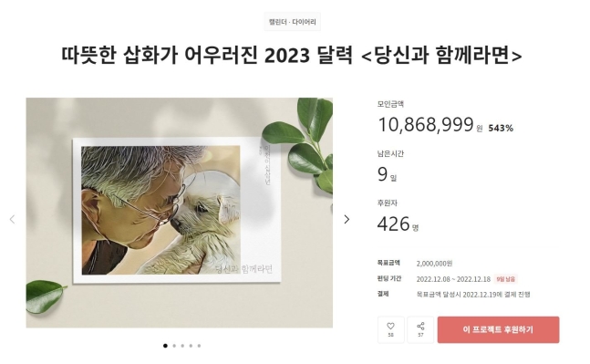 '당신과 함께라면'의 펀딩 금액은 달력과 그림 엽서로 구성된 세트별로 책정됐다. 1세트에 2만원, 2세트에 3만6000원, 4세트에 6만4000원 등 구매 개수가 많으면 할인율도 높아졌다.