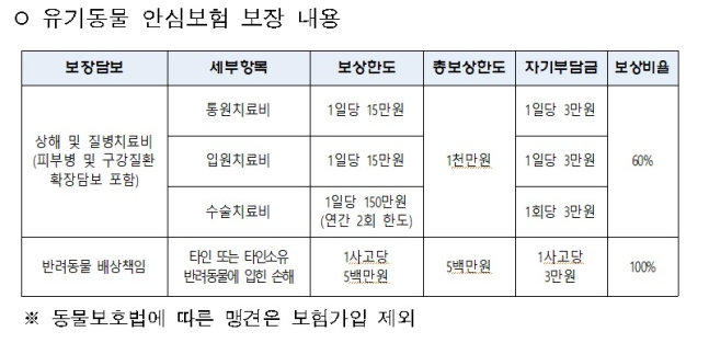 '유기동물 안심보험'은 서울시와 DB손해보험이 협력해 출시된 보험 상품이다. 입양 유기동물의 질병 치료비, 상해치료비, 타인이나 타인 소유의 반려동물에게 입힌 손해에 대한 배상책임을 보장해 준다.