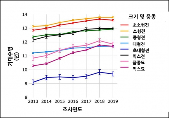 반려견의 기대수명은 크기에 따라 다양했는데, 소형견이 13.53세로 기대수명이 가장 길었고, 초소형견(13.36세), 믹스견(12.71세), 중형견(12.7세), 대형견(11.51세), 초대형견(9.51세) 순으로 나타났다. 반려묘는 믹스묘(11.12세)가 품종묘(11.54세)보다 짧았다.