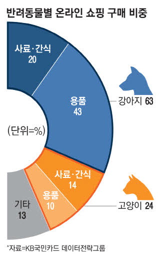 최근 KB국민카드 데이터전략그룹에 따르면 반려동물 관련 온라인 쇼핑 중 63%가 강아지 용품인 것으로 나타났다. 이 중 사료나 간식은 20%, 다른 반려용품은 43%를 차지했다. 매일 먹는 밥보다 옷이나 장난감 등을 사주는 데 더 많은 돈을 쓰고 있다는 해석이 가능하다.