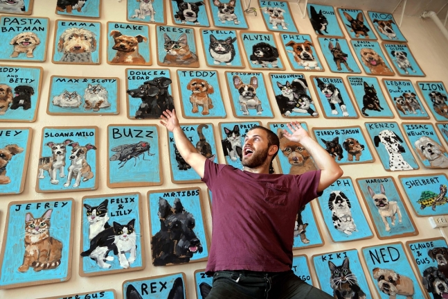벤 레노비츠는 흑연과 아크릴 물감으로 팝아트 스타일의 반려동물 초상화를 그리는 것으로 유명하다.