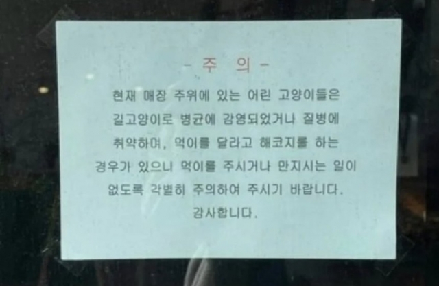 안내문에 따르면 점주는 “현재 매장 주위에 있는 어린 고양이들은 길고양이”라며 “병균에 감염되었거나 질병에 취약하며 먹이를 달라고 해코지하는 경우가 있다”고 설명했다.