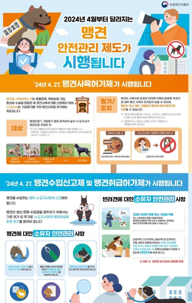 앞으로 도사견, 아메리칸 핏불테리어, 아메리칸 스태퍼드셔 테리어, 스태퍼드셔 불 테리어, 로트와일러 등 동물보호법상 맹견으로 지정된 5종은 오는 10월26일까지 기질평가를 통과한 후 시·도지사의 허가를 받아야 사육할 수 있다.