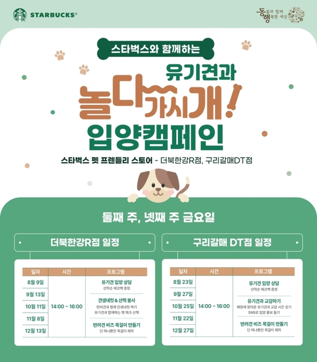 스타벅스 코리아가 '동물과 함께 행복한 세상'과 함께 반려동물 친화 매장인 더북한강R점과 구리갈매DT점에서 유기 동물 입양 캠페인 '놀다가시개'를 진행한다.