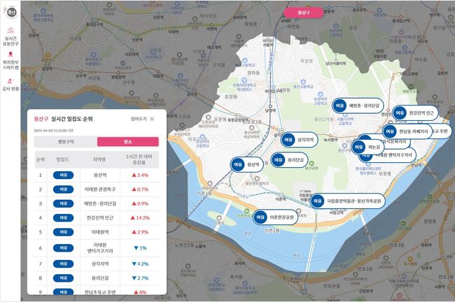 용산구 전역 16개 동과 함께 이태원 관광특구, 해방촌, 경리단길, 용리단길, 이촌한강공원 등 주요 14개 지역에 대해 인구 밀집도와 1시간 전 대비 증감률을 제공해, 인파 변화에 빠르게 대응할 수 있도록 돕는다.