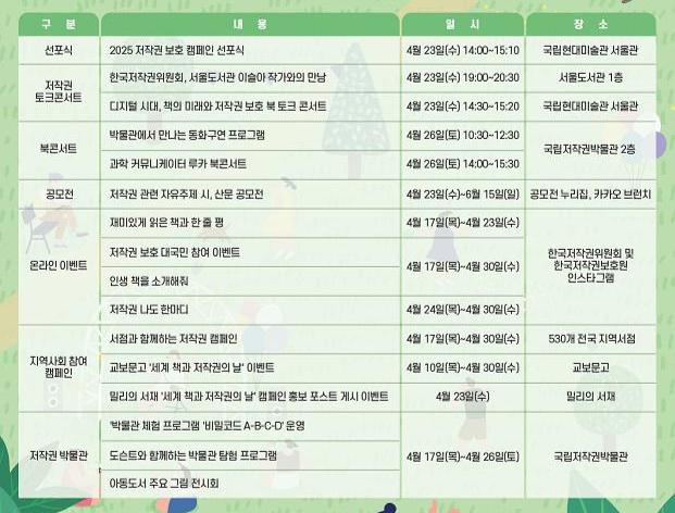 이번 캠페인은 유네스코가 1995년 제정한 ‘세계 책과 저작권의 날’을 기념해, 창작자의 권리를 보호하고 책과 저작권의 가치를 널리 알리기 위한 취지에서 마련됐다. 문체부는 유명 작가와의 토크콘서트를 비롯해 저작권 인식 제고를 위한 공모전, 체험행사, 지역 서점과 기업의 참여 행사까지 전국적 규모의 홍보 활동을 추진한다.