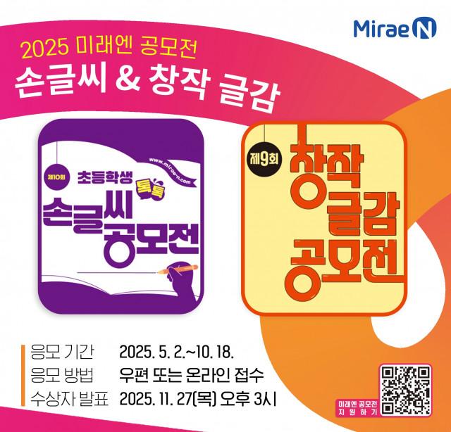 교과서 발행 부수 1위 기업 미래엔이 ’제10회 초등학생 톡톡 손글씨 공모전’과 ’제9회 창작 글감 공모전’을 개최하고 응모작을 모집한다. 이번 공모전의 접수 마감일은 10월 18일이고, 수상자는 11월 27일에 미래엔 홈페이지에서 발표한다.