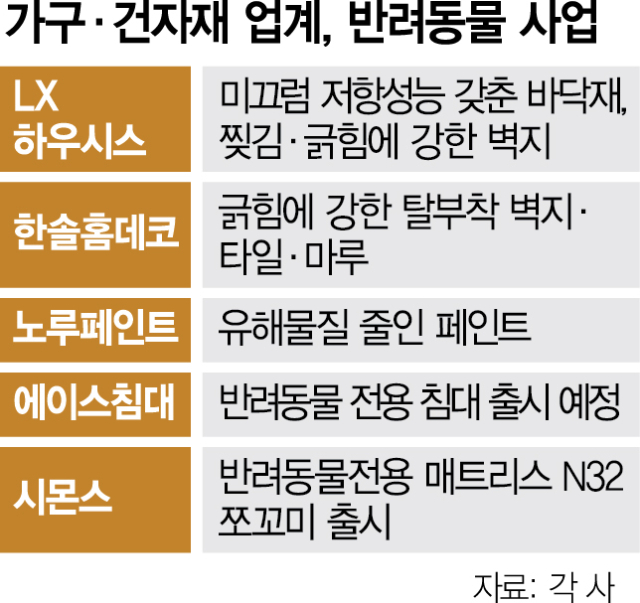 건자재 업계에서는 LX하우시스와 한솔홈데코(025750)가 적극적으로 반려동물 연관 용품 시장을 공략하고 있다. LX하우시스가 내놓은 디아망 포티스 벽지는 찢김·긁힘에 강한 것이 장점이다. LX하우시스는 미끄럼 저항성능 갖춘 엑스컴포트 바닥재도 보유하고 있다.