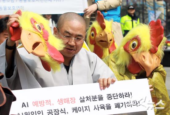 한국동물보호연합과 대한불교조계종, 천주교창조보전연대, 전국공무원노조 등 시민단체 회원들과 종교계 관계자들이 27일 오전 서울 광화문광장에서 '조류독감(AI) 살처분 방지 및 제도개선 촉구 기자회견'을 개최, 참가자들이 닭머리 모형 탈을 쓰고 포퍼먼스를 진행하고 있다.