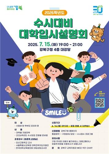 서울 강북구(구청장 이순희)는 오는 7월 15일(화) 오후 7시 강북구청 대강당에서 2026학년도 수시대비 대학입시설명회를 개최한다고 밝혔다.