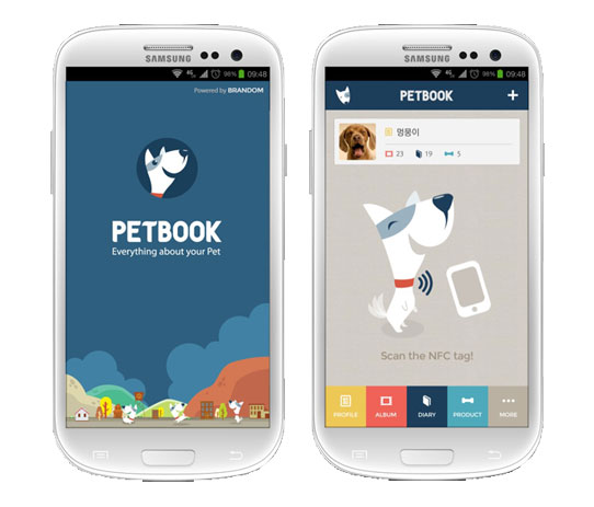 펫북은 반려동물의 프로필과 동물등록번호를 기입하고, 스마트인식표를 통해 반려동물을 잃어버렸을 때 실종신고를 할 수 있는 서비스다. 반려동물을 발견한 제3자가 스마트인식표를 태깅하면 등록된 정보를 열람, 주인과 연락해 반려동물을 찾아줄 수 있다. 이 외에도 반려동물의 사진을 촬영하고 메모할 수 있으며, 다이어리에 진료 및 예방접종 일정을 기록할 수 있다.