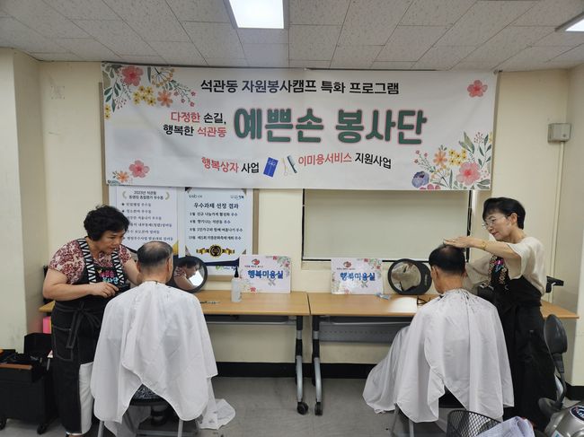 성북구(구청장 이승로) 석관동 주민센터(동장 전영훈) 자원봉사캠프 ‘예쁜손 봉사단’은 2018년 5월 석관동 통장들이 뜻을 모아 결성한 단체로, 올해로 8년째 봉사활동을 꾸준히 이어오고 있다. 봉사단은 다양한 활동을 진행하고 있지만, 미용사 자격증을 보유한 김희자·김창순 씨를 중심으로 운영하는 무료 이미용 봉사가 대표 프로그램이다.
