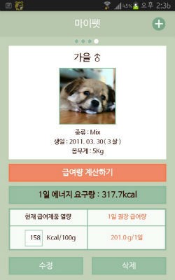 이 앱의 주요 기능은 급여량 계산기다. 키우고 있는 반려견의 나이와 몸무게 등 정보를 입력하면 현재 건강상태에 대한 정보를 바탕으로 하여 1일 필요한 에너지 요구량이 계산된다.